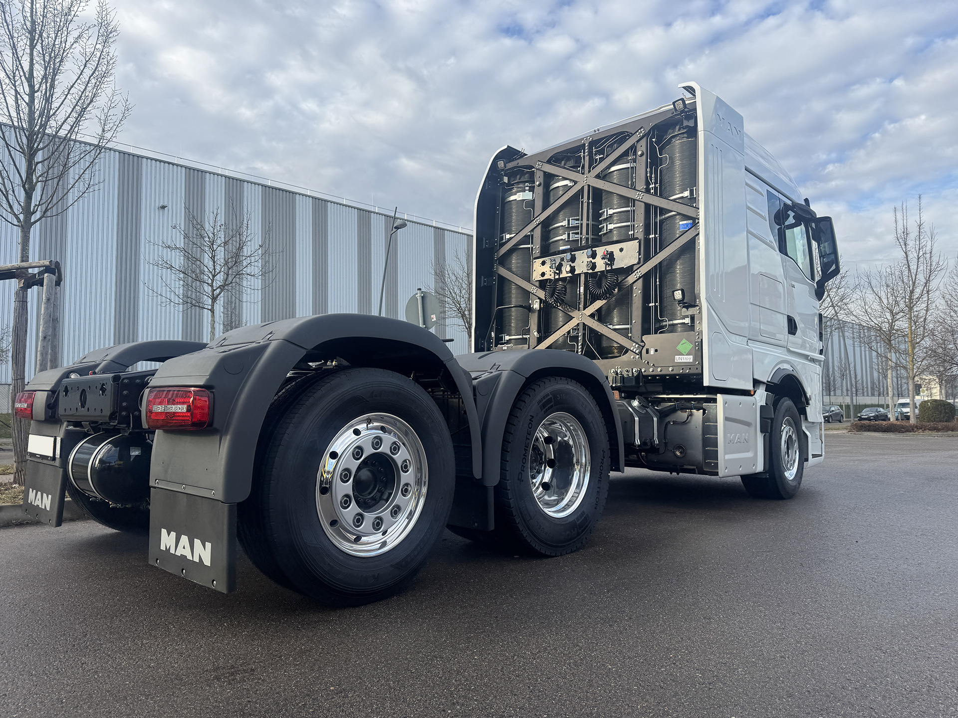 „Ein Meilenstein der Mobilität: Der erste in Deutschland zugelassene serienmäßige MAN hTGX als Gefahrgut-Sattelzugmaschine (ADR) mit Flüssigwasserstoff-Antrieb, im Besitz der Firma WTK -Wittener Transport – Kontor Heinrich Stratmann GmbH- aus Witten in Nordrhein-Westfalen.“